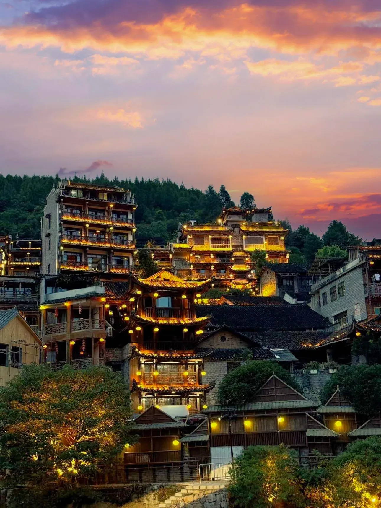 Тип: Древний город, Историческое и культурное место, место проживания этнических меньшинств Расположенный на юго-западе Чжанцзяцзе в провинции Хунань древний город Фэнхуан, или Древний город Феникс, известен как "самый красивый город в Китае" и "Город на картинке". Этот старый город, построенный в 1704 году, получил звание "Национальной туристической достопримечательности" за его очаровательные пейзажи с многочисленными древними памятниками, башнями, мостами, улицами и другими зданиями, а также богатую культуру мяо, туцзя и других 26 этнических меньшинств. Возможно, вас привлекут простые, но очаровательные обычаи, которые существуют в приграничном городе, и вы захотите посетить это место. Но как только вы приедете сюда, вы поймете, что этим ее очарование не ограничивается. После дождя вы можете прогуляться по дорожкам, вымощенным голубым камнем; прокатиться на лодке по реке Туоцзян и полюбоваться 100-летними зданиями на сваях; взобраться на древние надвратные башни и ощутить все перипетии древнего города; спокойно понаблюдать за старухой, стирающей белье на берегу реки.; или посидите в одиночестве у окна в кафе-баре, молча любуясь изысканным пейзажем и позволяя своим мыслям свободно витать в воздухе...... Возможно, в этом и заключаются секреты очарования древнего города. Раньше это было место сбора политиков, военачальников, вождей племен мяо и бандитов, которое можно считать стандартным варварским местом. Но именно в таком городке, спрятанном в горах, как этот, за последние сто лет появились премьер-министр Китайской Республики Сюн Силин (熊希龄), знаменитый писатель Шэнь Конгвен (沈从文) и художник Хуан Юнъюй (黄永玉), благодаря чему древний город стал ярким, как жемчужина, и в нем сохранились обычаи местных жителей. западная Хунань. Посетив этот древний город площадью около 10 квадратных километров, вы сразу же полюбите его и откроете для себя тайну его глубокой культуры. Чем заняться в древнем городе Фэнхуан? Топ-1 живописных пейзажей, снятых на камеру Пейзажи древнего города Фэнхуан ранним утром выглядят просто восхитительно. В 6:00-7:00 древний город еще не проснулся. Тонкий утренний туман окутывает весь город. Прогуляйтесь по тихому древнему городу, подышите свежим воздухом, и вы не останетесь равнодушными. Обычно ранним утром здесь бывает меньше людей, поэтому это самое подходящее время, чтобы запечатлеть красоту Фэнхуана с помощью фотоаппарата. Ночной пейзаж на реке Туоцзянг также очарователен и опьяняет, особенно после дождя. Мост Наньхуа и горная вершина недалеко от Шаваня - отличные места для ночного просмотра. Другие рекомендуемые места для съемок - скала Тиоцзян, башня Ваньмин, мост Феникс Хонг, Дяоцзяолоу и Большое водяное колесо и т.д. Топ-2. Исследуйте дома на сваях, полные очарования этнического меньшинства Туцзя. Одной из достопримечательностей древнего города являются старинные здания на сваях, которые полны очарования этнического меньшинства туджа. Однако в настоящее время большинство зданий на сваях вдоль реки разрушены. Уцелела лишь дюжина старых домов, опирающихся на тонкие деревянные столбы, стоящие в реке и хранящие богатую историю города. Топ-3 прогулок по улочкам и долинам Фэнхуана в дождливые дни Известный китайский поэт Дай Ваншу однажды написал такую сцену: Идешь под дождем по длинной аллее, встречаешь дев